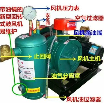 回轉式鼓風機的結構,主要是由6部分組成的,鼓風機主機,電機,油氣分離室,底座(以及油箱),滴油嘴,壓力表,止回閥,皮帶等!